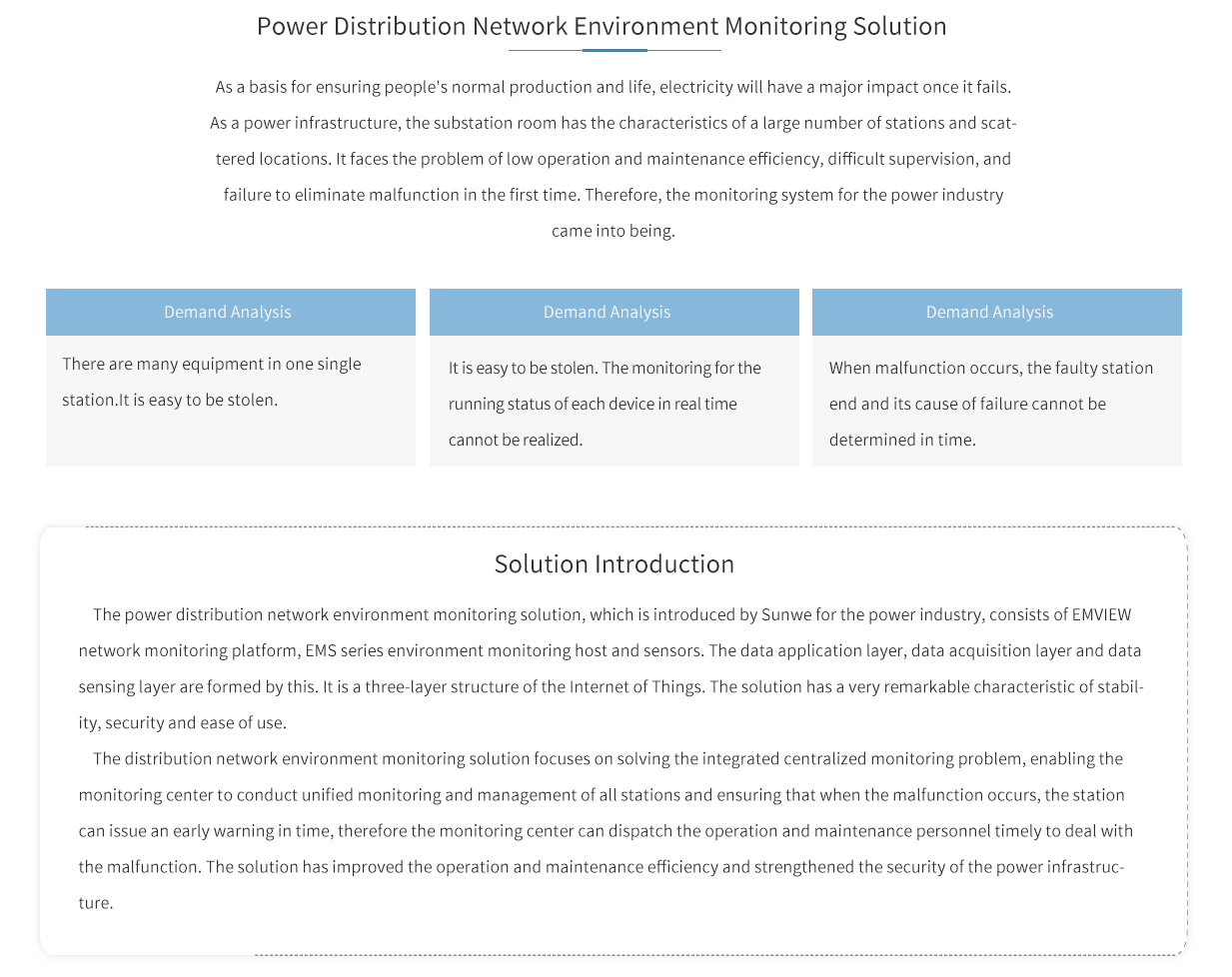 The power distribution network environment monitoring solution, which is introduced by Sunwe for the power industry, consists of EMVIEW network monitoring platform, EMS series environment monitoring host and sensors. The data application , data acquisition and data sensing are formed by this. It is a three- structure of the Internet of Things. The solution has a very remarkable characteristic of stability, security and ease of use.